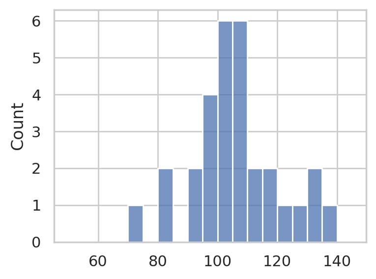 sns.histplot(sample, bins=range(50,150,5), ax=ax2)