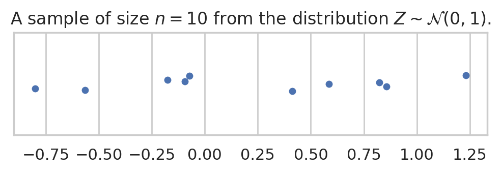 ax.set_title(r"A sample of size $n=10$ from the distribution $Z \sim \mathcal{N}(0,1)$.")