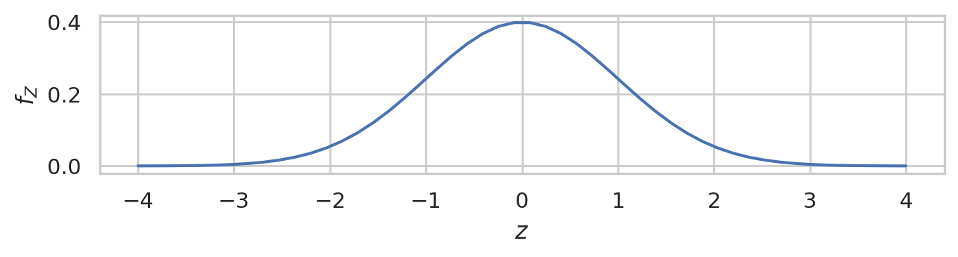 The above graph tells you everything you need to know about the random variable \(Z\). The possible values of \(Z\) are concentrated around the mean \(\mu=0\). The region of highest density is roughly between \(z=-1\) and \(z=1\), with most of values between \(z=-2\) and \(z=2\), then the probability density drops off to (almost) zero for \(z<-3\) and \(z>3\).
