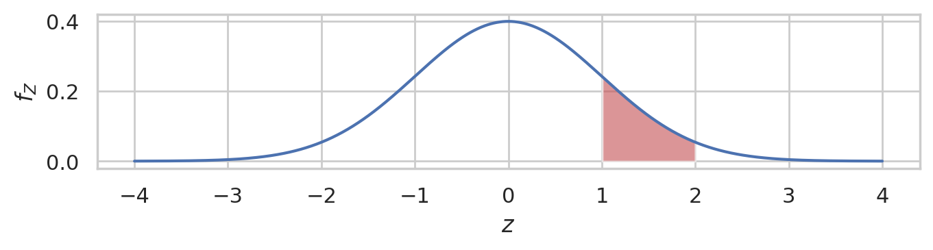 Calculating probabilities with the continuous random variable \(Z\) requires using integration, which the process of computing the total area under a curve for some region. For example, the probability that the random variable \(Z\) will have a value somewhere between \(1\) and \(2\) is defined as \(\textrm{Pr}(\{1 \leq Z \leq 2\}) = \int_{z=1}^{z=2} f_Z(z) dz\).