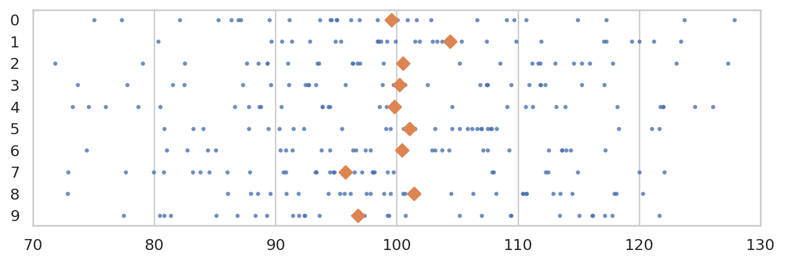 The diamond markers indicate the position of the sample means computed from each sample: \([\overline{\mathbf{x}}_1, \overline{\mathbf{x}}_2, \overline{\mathbf{x}}_3, \ldots, \overline{\mathbf{x}}_{10}]\).