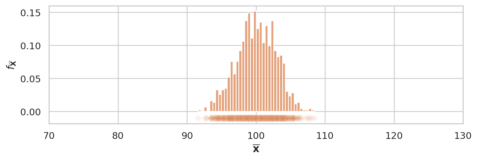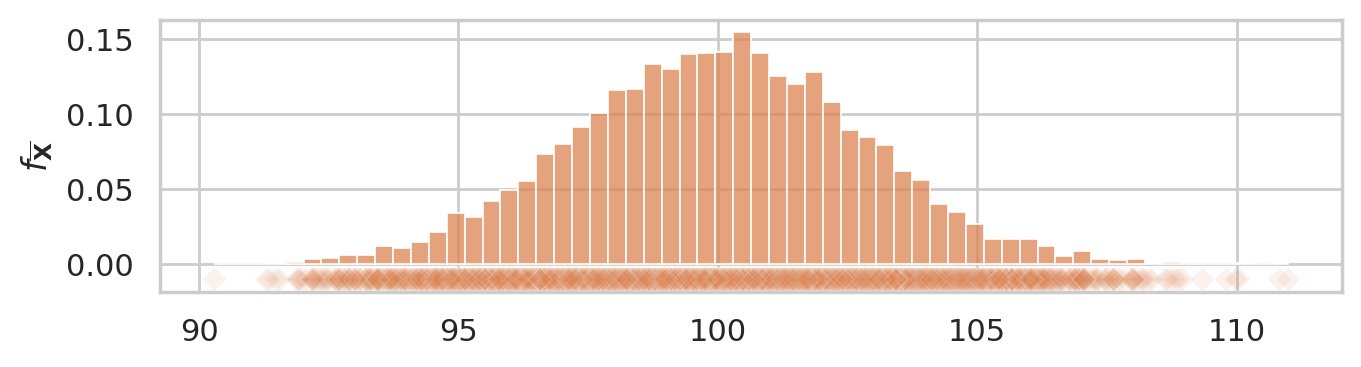 The above figure shows the sampling distribution of the mean for samples of size \(n=30\) from the general population model \(X \sim \mathcal{N}(\mu=100, \sigma=15)\). The histogram shows the “density of diamond shapes,” and provides a representation of the sampling distribution of the mean \(\overline{\mathbf{X}} = \tt{mean}(\mathbf{X})\).