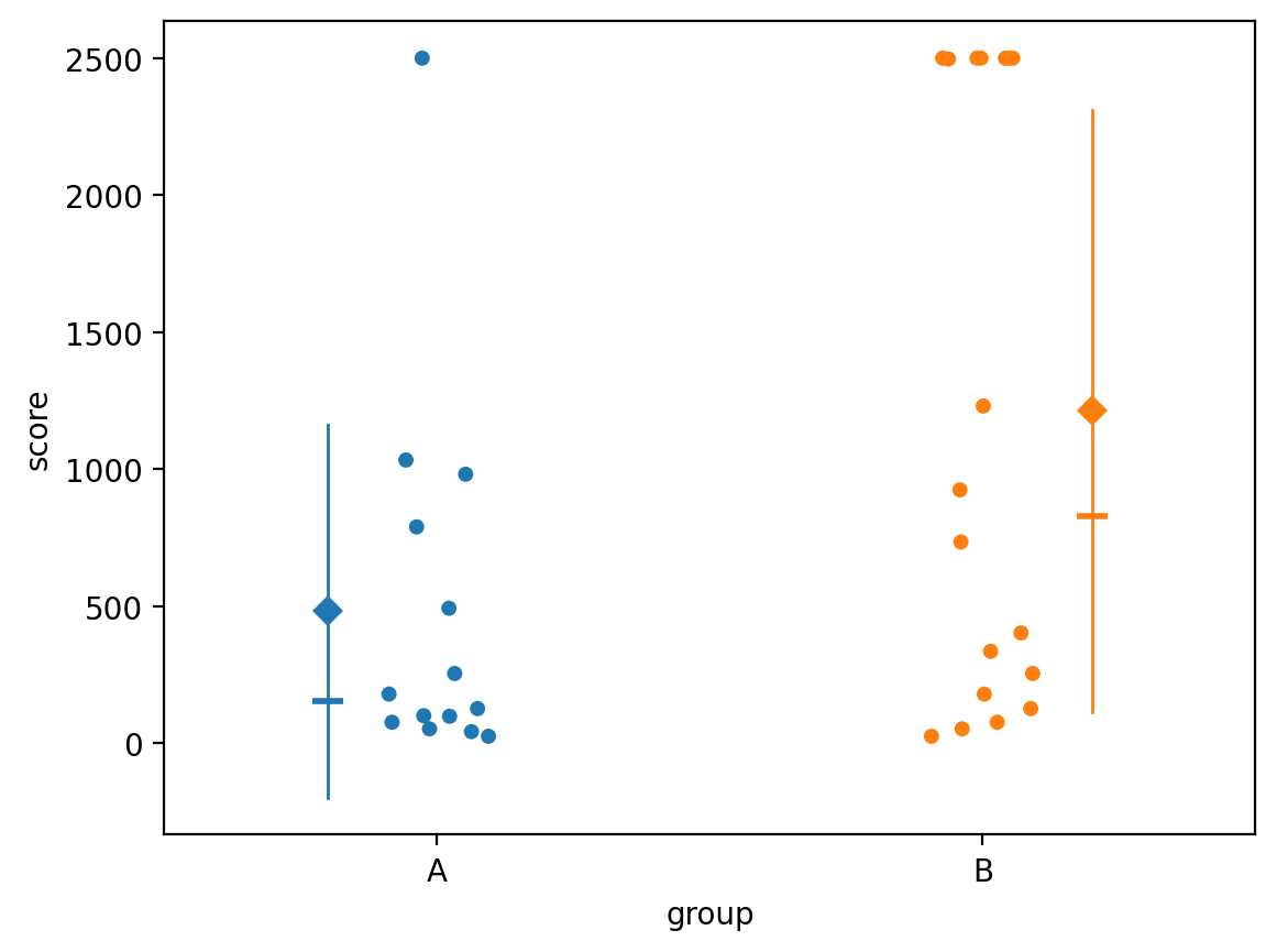 The Mann-Whitney \(U\)-test is better at ignoring the outliers, and correctly fails to reject the null. Indeed, looking at the graph, we see there is not a big difference between the two groups.