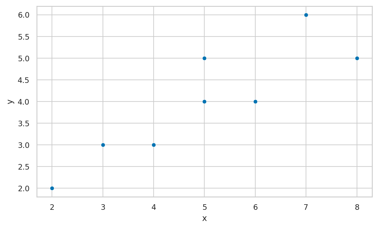 Draw a scatter plot for the following dataset of (x,y) pairs: { (2,2), (3,3), (4,3), (5,5), (6,4) }.