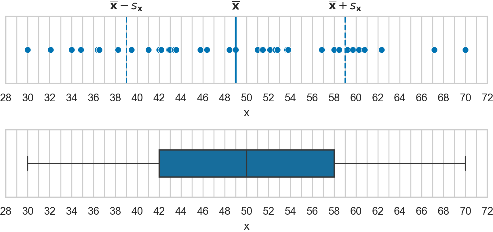 The paper authors forgot to include the numerical summary statistics for the variable \(\mathbf{x}\). Use the information in the graphs to determine the values of the following descriptive statistics: \(\textbf{mean}(\mathbf{x})\), \(\textbf{med}(\mathbf{x})\), \(\textbf{std}(\mathbf{x})\), \(\textbf{var}(\mathbf{x})\), \(\textbf{min}(\mathbf{x})\), \(\textbf{Q}_{1}(\mathbf{x})\), \(\textbf{Q}_{2}(\mathbf{x})\), \(\textbf{Q}_{3}(\mathbf{x})\), \(\textbf{max}(\mathbf{x})\), \(\textbf{IQR}(\mathbf{x})\), \(\textbf{range}(\mathbf{x})\).
