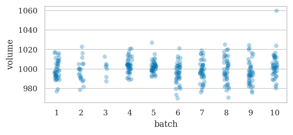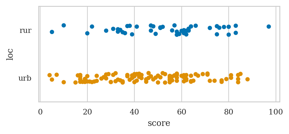so he starts by generating a strip plot of the score variable for the two values of the location variable.