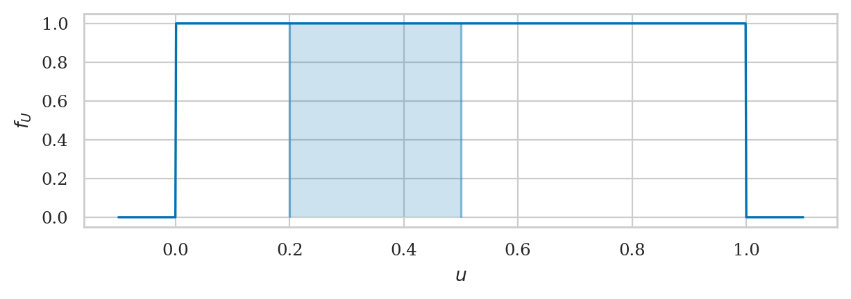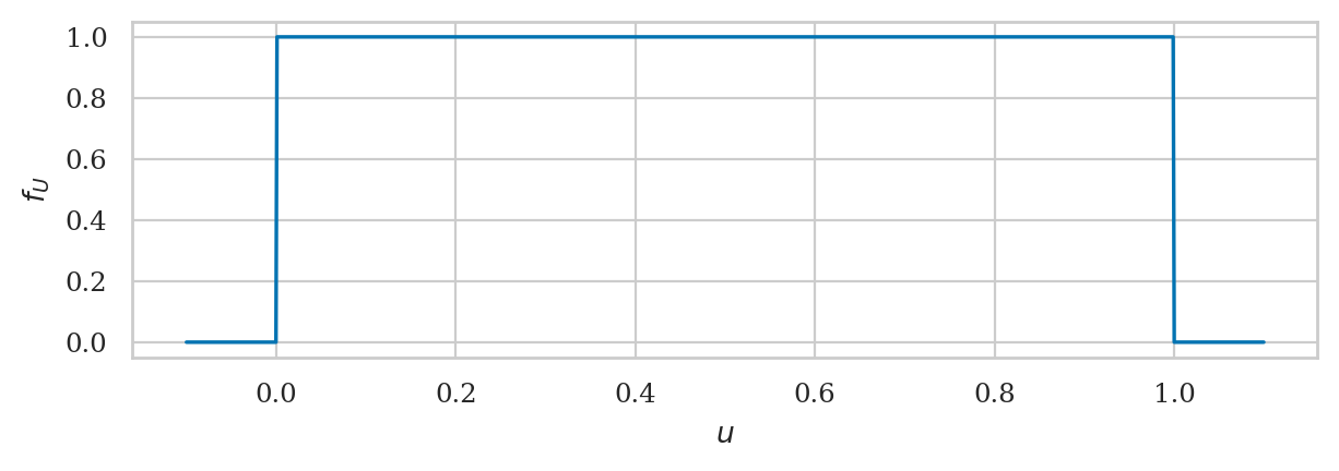 The uniform distribution \(U \sim \mathcal{U}(0,1)\) is described by the following probability density function: