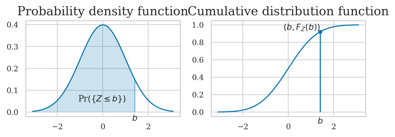 \(f_X\): the probability density function (PDF) is a function that assigns probabilities to the different outcome in the sample space of a random variable. The probability distribution function of the random variable \(X\) is a function of the form \(f_X: \mathcal{X} \to \mathbb{R}\).