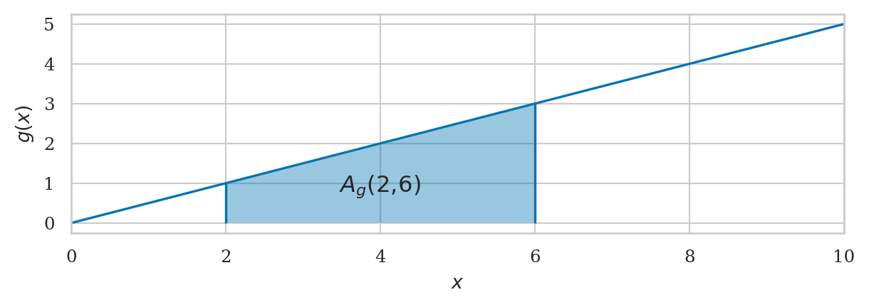 plot_integral(g, a=a, b=b, xlim=[0,10], flabel="g", autolabel=True);