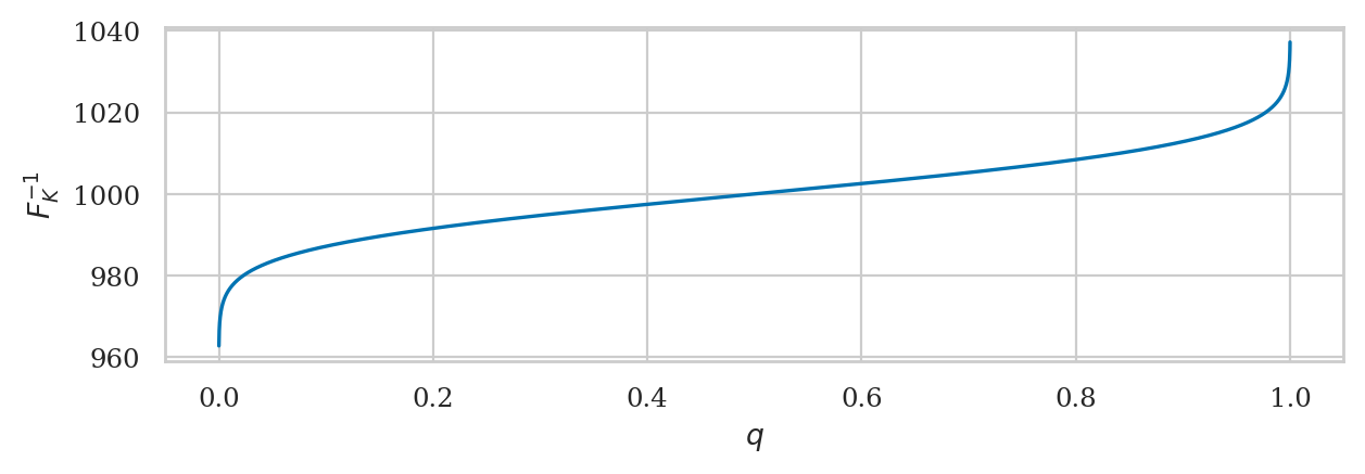 The first quartile (\(q=0.25\) quantile) is located at \(F_K^{-1}(0.25)\):