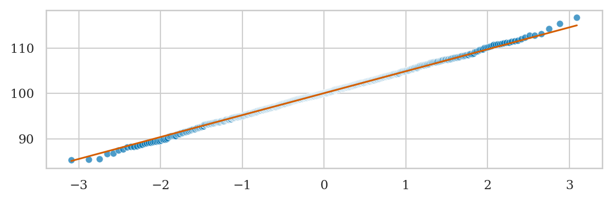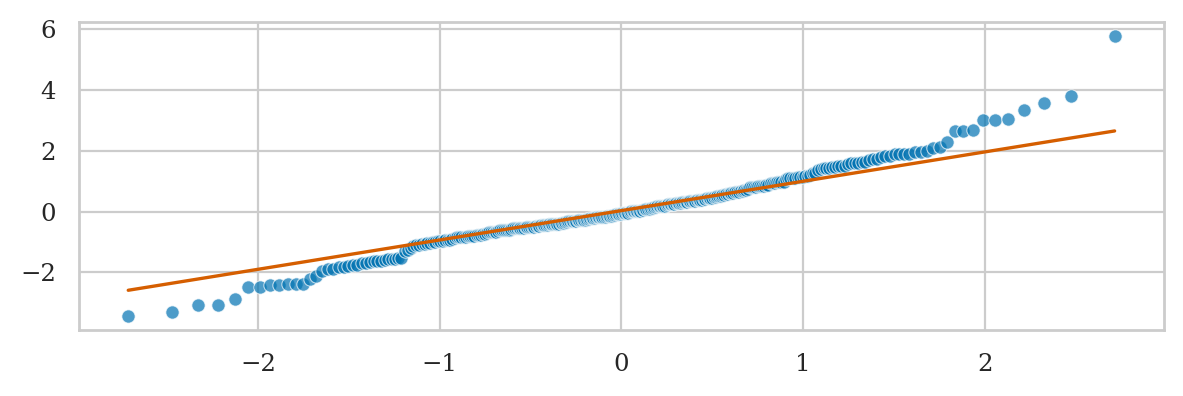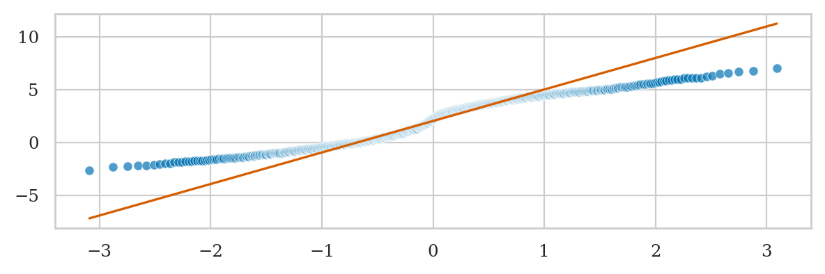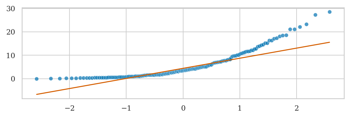 Note the lowest quantiles don’t match (exponential data limited to zero), and the high quantiles don’t match either (exponential data has a long tail).