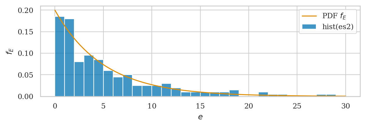 Here is the code for visual comparison of es2 and the theoretical model rvE \(=\mathrm{Expon}(\lambda=0.2)\), based on the probability density and cumulative probability distributions.