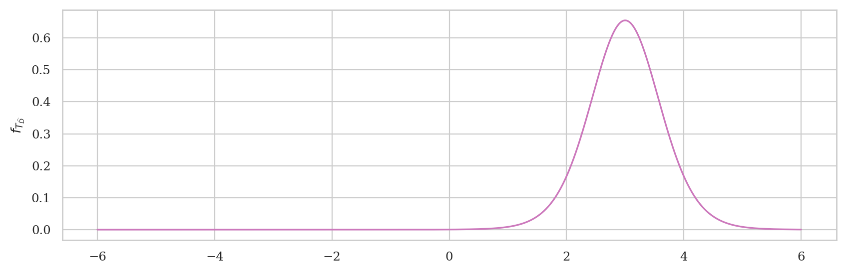 Case 2: the population mean \(\mu_X\) is unknown. We can draw the sampling distribution centred on the sample mean \(\overline{\mathbf{x}}\): $\( T_A \;\; \sim \;\; \mathcal{T}(n-1, \; \tt{loc}\!=\overline{\mathbf{x}}, \; \tt{scale}\!=\!\stderrhat{\overline{\mathbf{x}}}). \)$