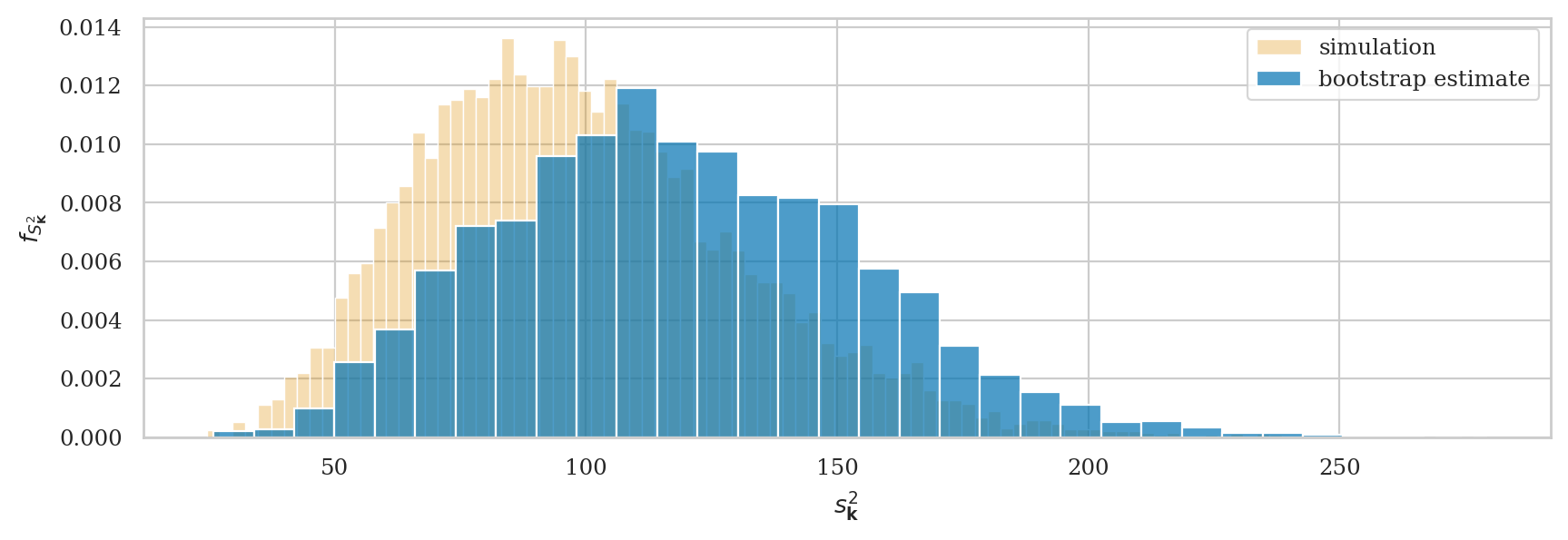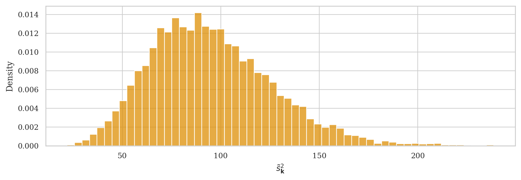 We can correct the bias in this estimator by simply using the normalization factor \((n-1)\) in the formula instead of \(n\). This is how we end up with the unbiased estimator formula \(s_{\mathbf{x}}^2 = \frac{1}{n-1} \sum_{i=1}^n (x_i - \overline{\mathbf{x}})^2\), for which \(\mathbb{E}[S_{\mathbf{K}}^2] \approx \sigma_K^2 = 100\).