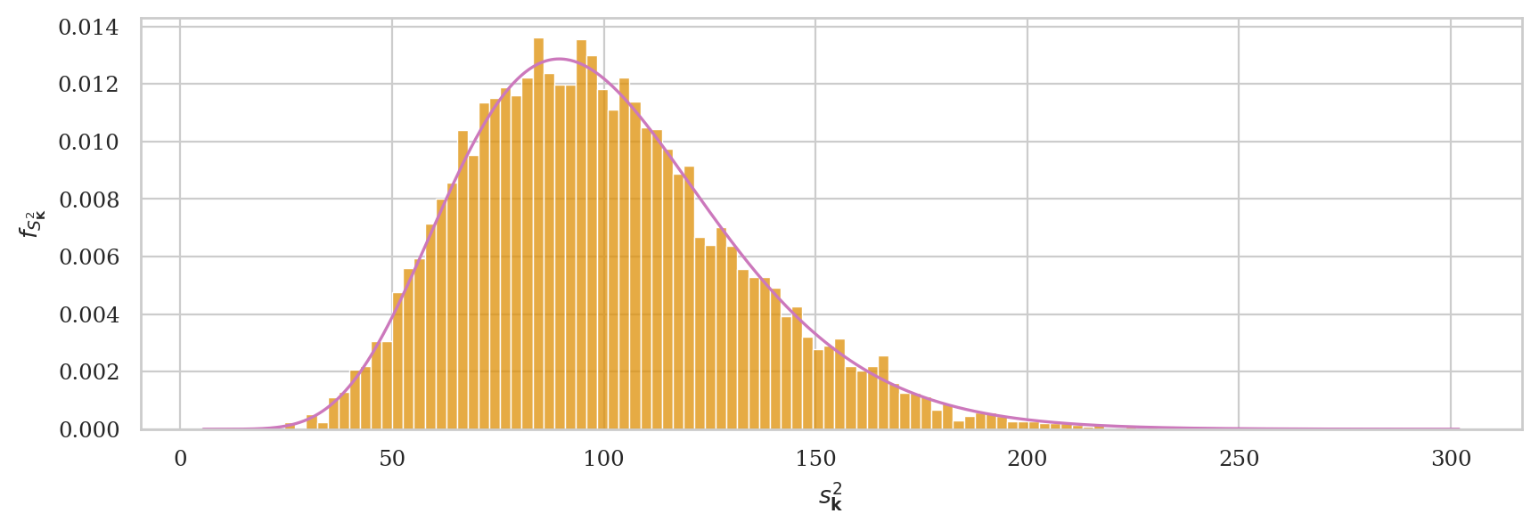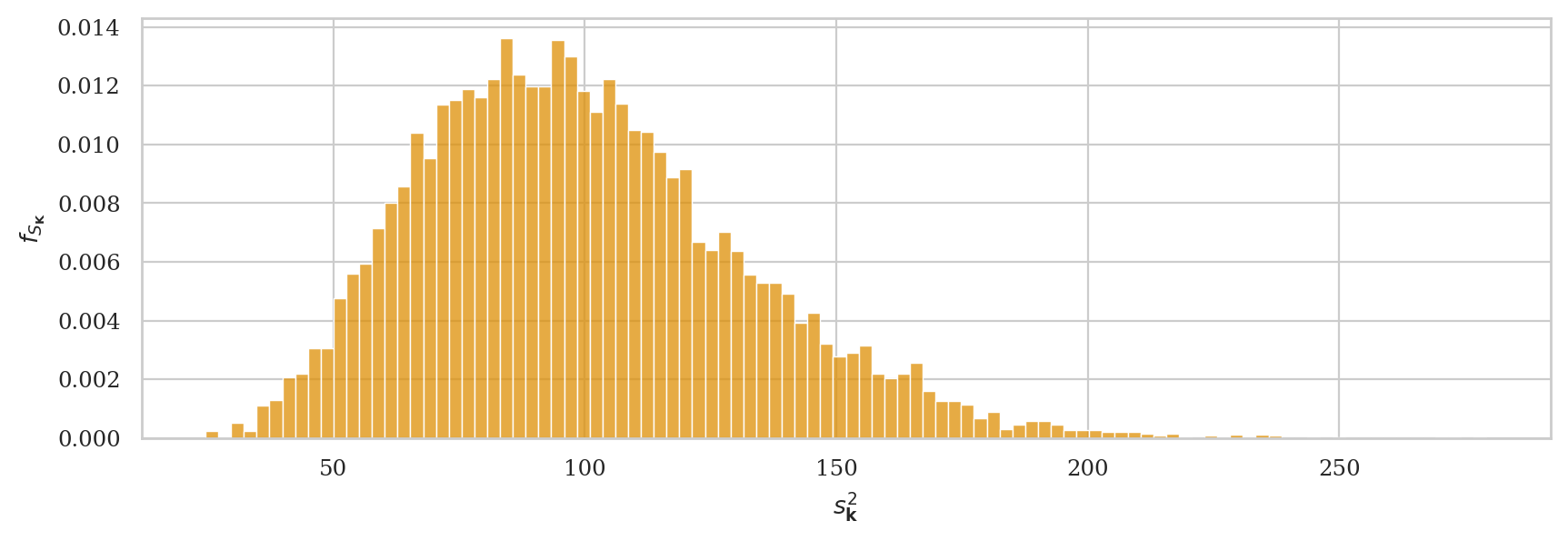 The expected value of the sampling distribution for this estimator does not equal the population variance, \(\mathbb{E}[\tilde{S}^2] \neq \sigma_K^2 = 100\). The expected value \(\mathbb{E}[\tilde{S}^2]\) will consistently underestimate \(\sigma_K^2\).