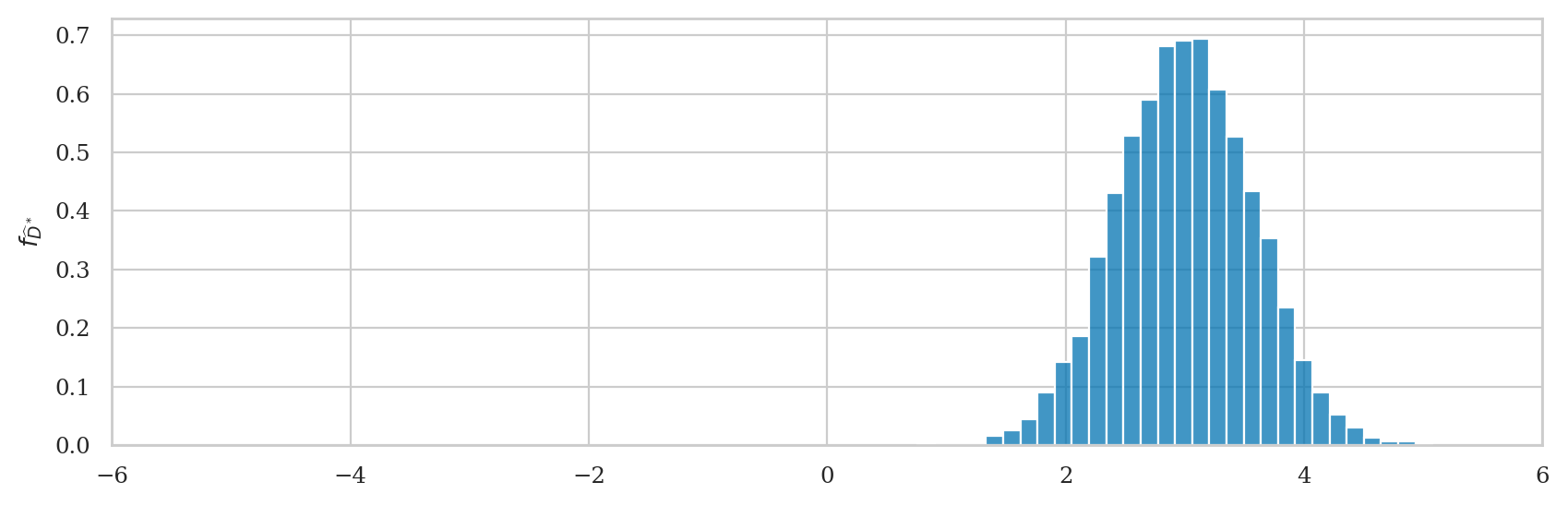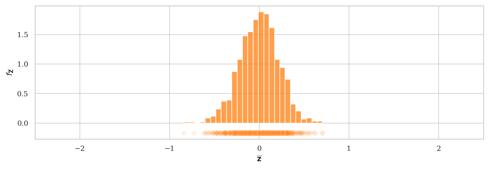 The sampling distribution of the estimator \(g\) is denoted \(\hat{\Theta} = g(\mathbf{X})\) and describes the estimates we can expect to observe from random samples from the population \(\mathbf{X} = (X_1, X_2, \ldots, X_n)\). For example, the sampling distribution of the mean is the random variable \(\overline{\mathbf{X}} = \Mean(\mathbf{X}) = \tfrac{1}{n}\!\sum_{i=1}^n X_i\).
