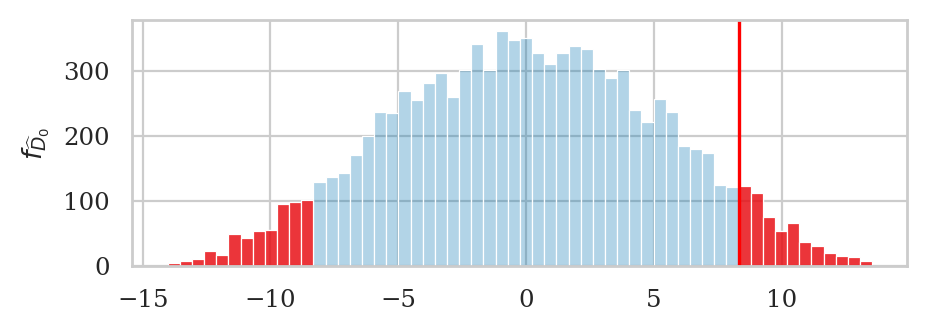 Sampling distribution \(\hat{D} = \DMeans(\mathbf{X}, \mathbf{Y})\): the difference between means computed from two random samples \(\mathbf{X}\) and \(\mathbf{Y}\).