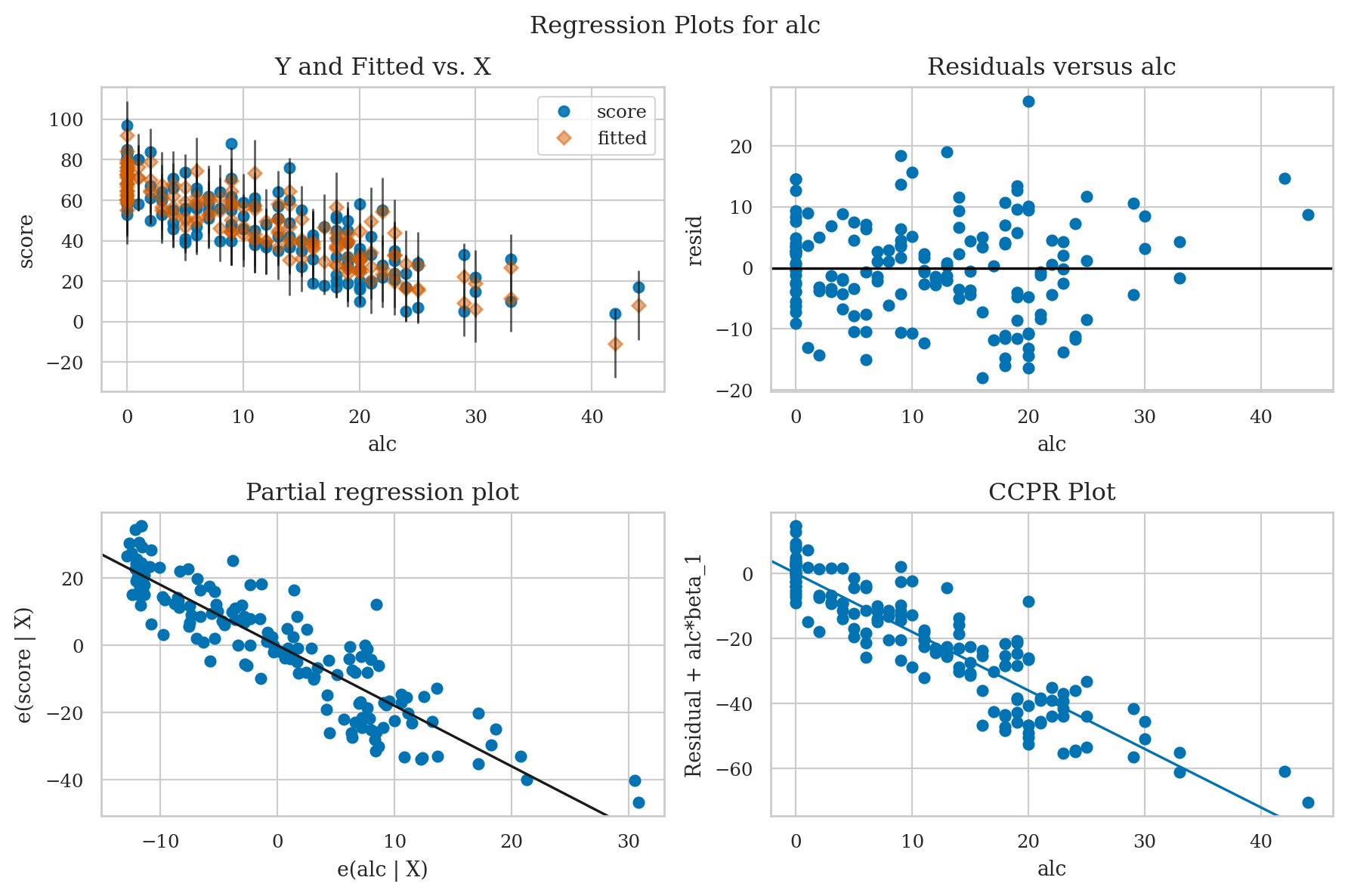 plot_partregress("score", "alc", exog_others=[], data=doctors, obs_labels=False, ax=ax1)