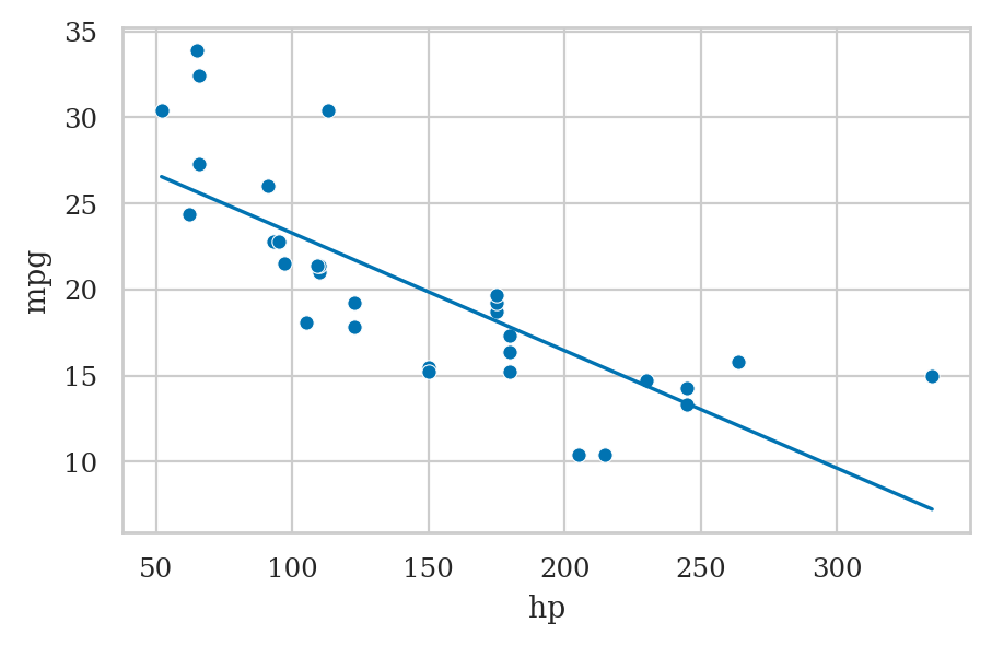 lmcars = smf.ols("mpg ~ hp", data=mtcars).fit()