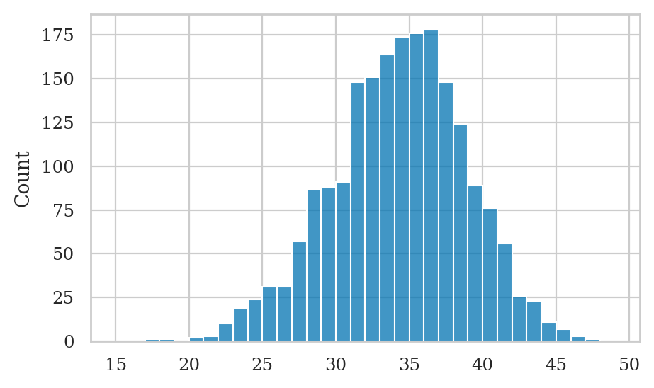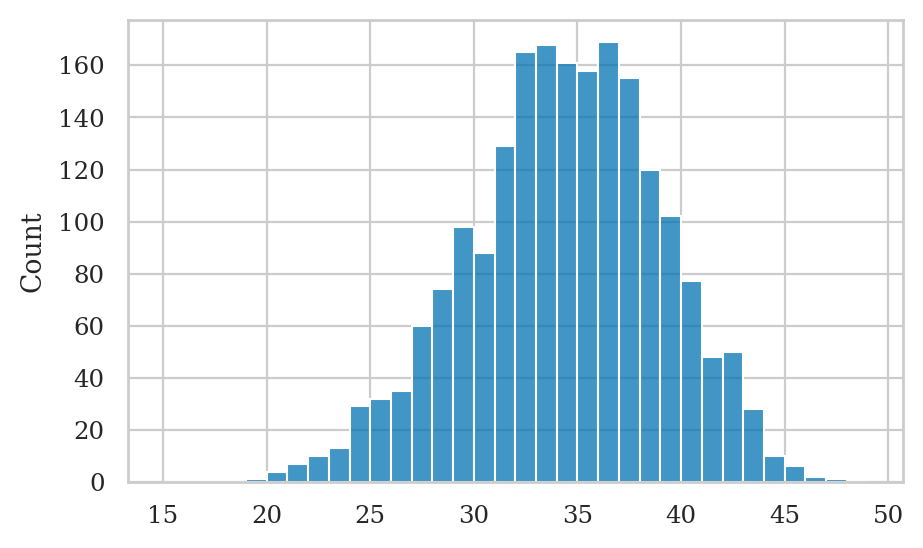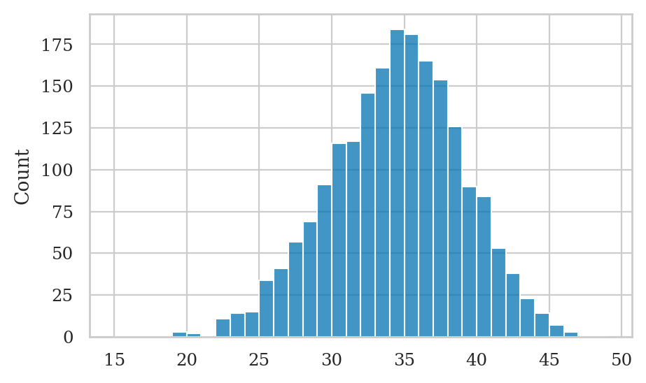 sns.histplot(x=numheads_pred, bins=range(15,50));