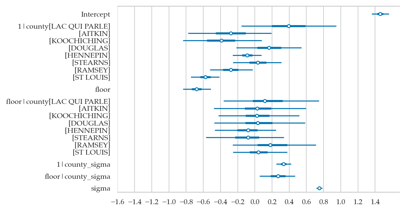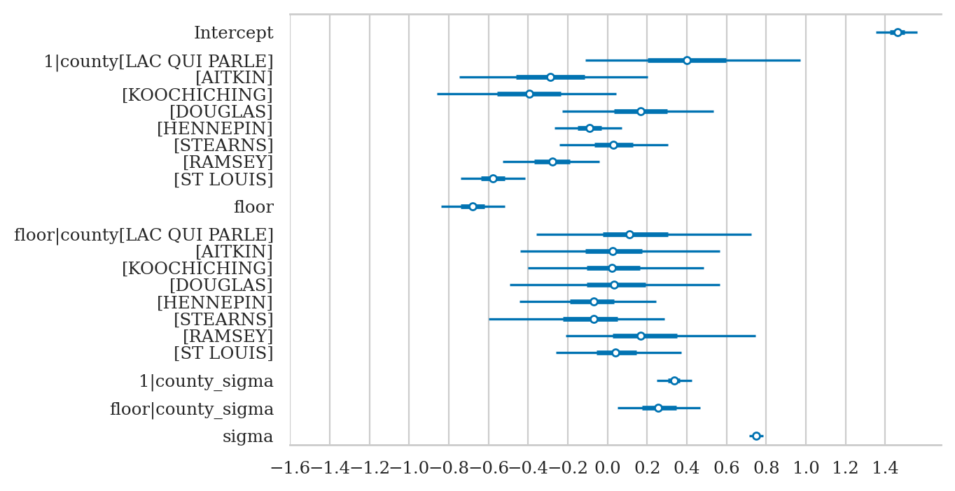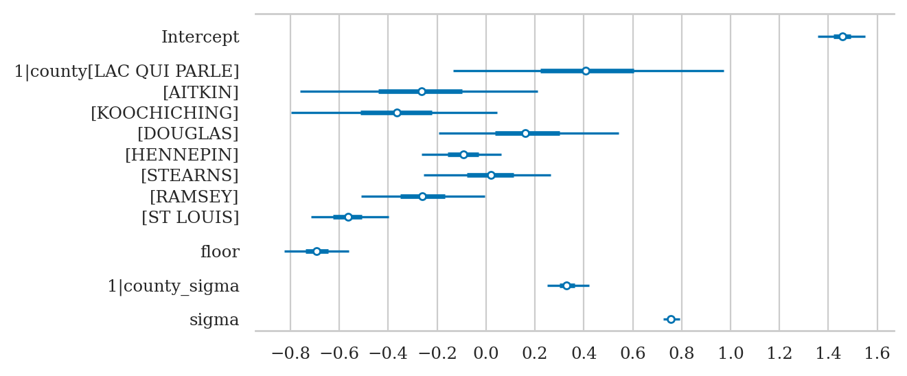 mod1 = bmb.Model(formula="log_radon ~ 1 + floor",