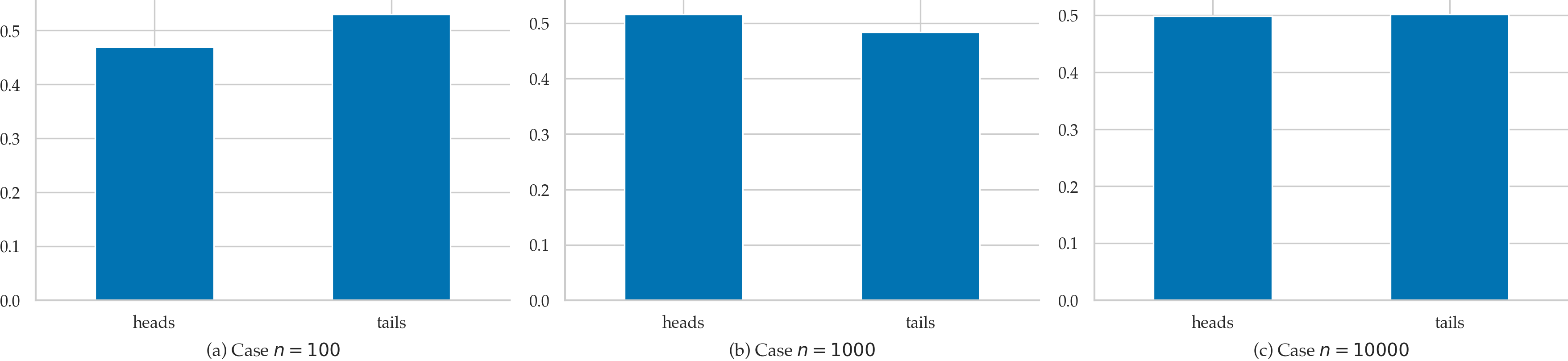 If we generate larger and larger sets of observations, for example $n=100$, $n=1000$, or $n=10\,000$, we will observe that the relative frequencies of the two outcomes get close to $\frac{1}{2}$ and $\frac{1}{2}$.