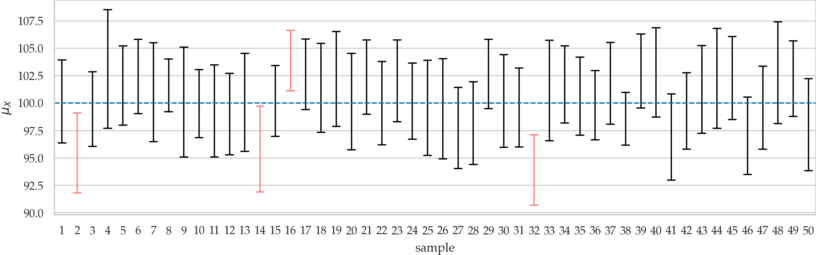 Intervals that don't include $\mu_X$ are drawn in light red.