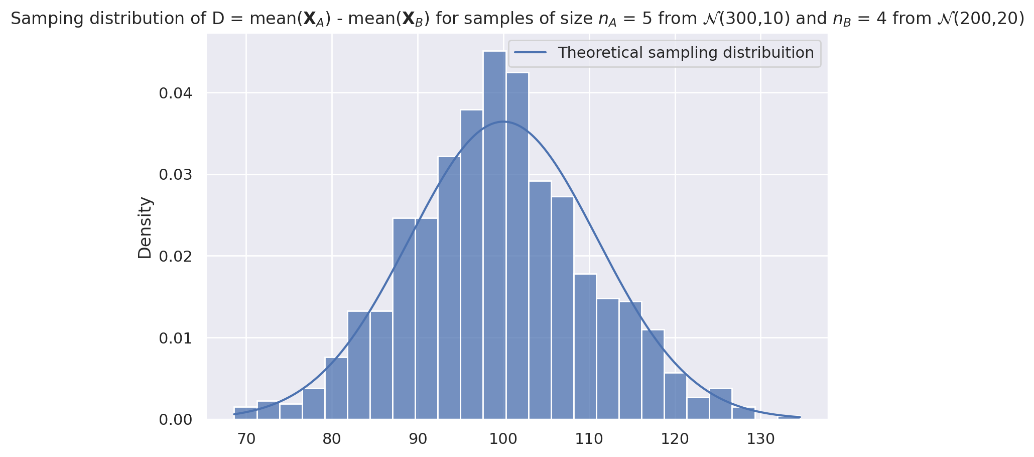 To answer these questions, consider the random samples \(\mathbf{X}_A = (X_1, X_2, \ldots, X_{n_A})\) and \(\mathbf{X}_B = (X_1, X_2, \ldots, X_{n_B})\), then compute the sampling distribution: \(D = \overline{\mathbf{X}}_A - \overline{\mathbf{X}}_{B}\).