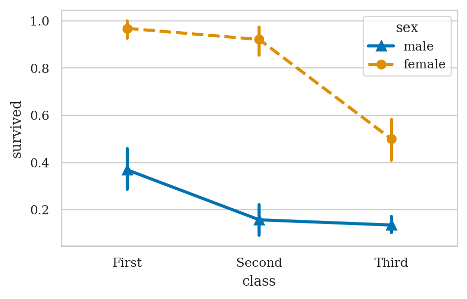 ax = sns.pointplot(data=titanic, x="class", y="survived", hue="sex",