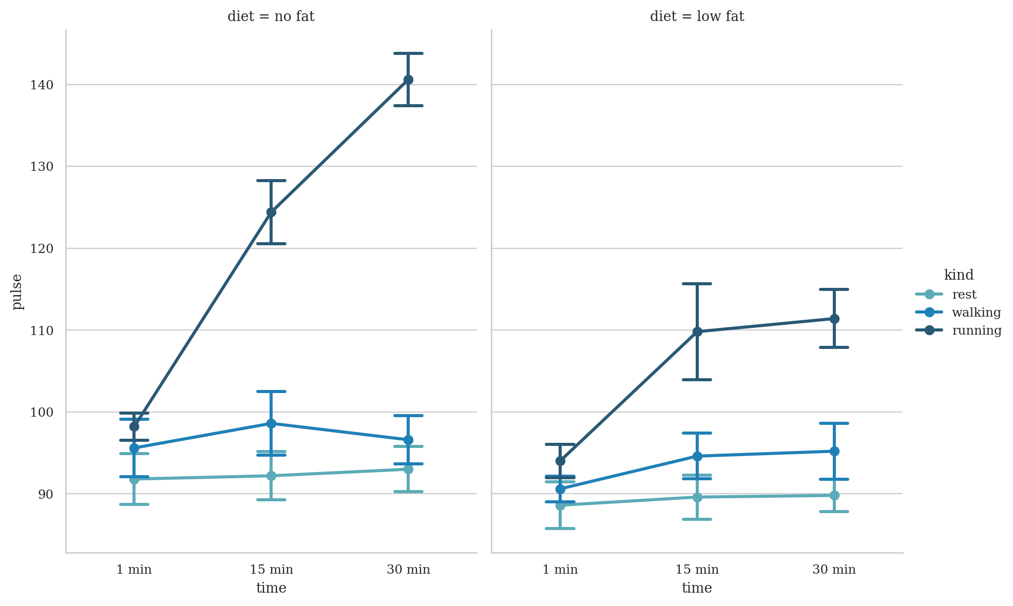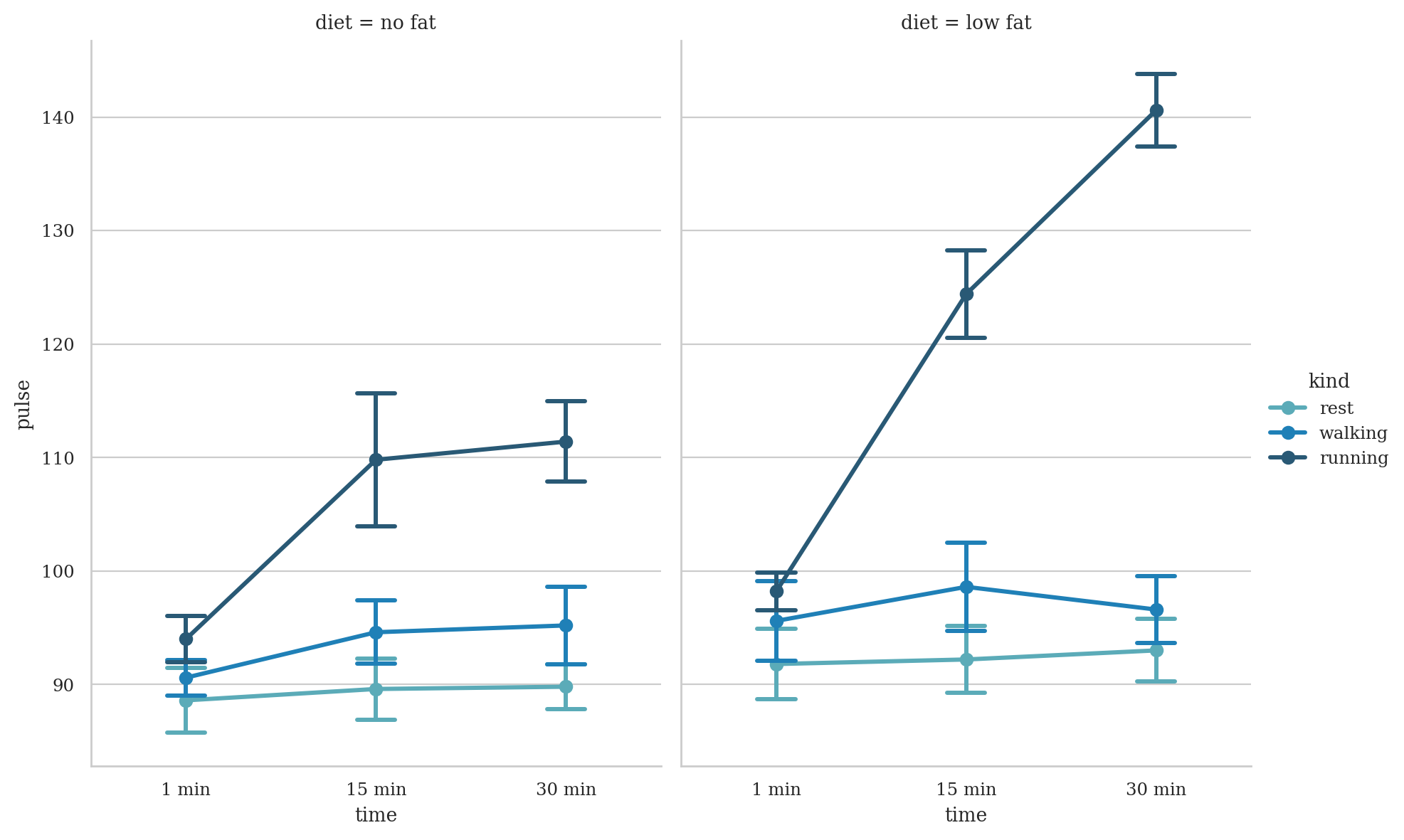 data=exercise, x="time", y="pulse", hue="kind", col="diet",