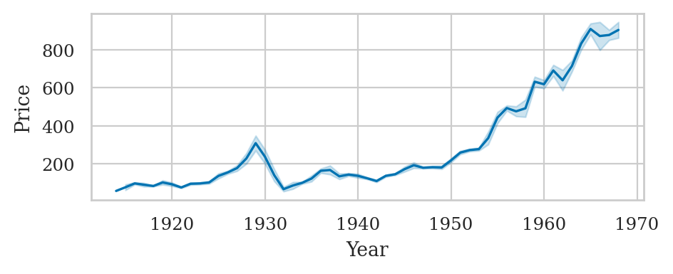 sns.lineplot(data=dowjones, x="Year", y="Price", estimator="mean", errorbar=("sd",1))